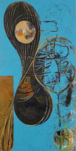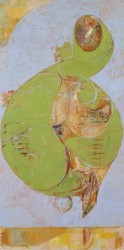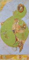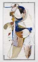 “I wanted to give various bodies to the template of the flame or tear-drop. The figure in Cropper has quite a flat shape like a paddle. It’s held in position by bright colour, acting like an outfit or veil with a grip on the figure. When you come to it on the first reading, perhaps the figure is recognisable like an icon, refined and solid like a letter of the alphabet. But on second reading, the forms might seem to come apart or be resistant. I score into the paint which can show the history of how the painting comes together and in Cropper this has the loose impression of fabric un-peeling. There is a map-like quality of a template or diagram. I made the paintings using sign writer’s brushes, so the image is threaded together and in this way it can also unravel.â€