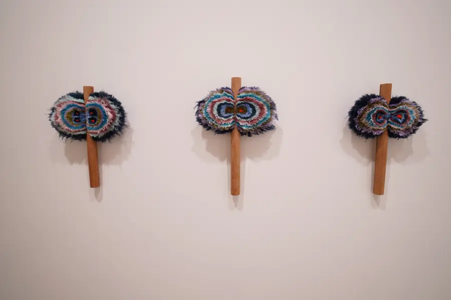‘Aleppo From the Dark’ by Tess Jaray flanks the entrance to one gallery, in a clean editing of form and colour. The six panel painting feels formal and considered in a journey that moves through exquisitely controlled drips (Olly Fathers and Ralph Anderson), welded steel (Steve Lewis), enormous papier mache sculpture (Olivia Bax), tufted totems (Will Cruickshank), cast object d’arte (Tim Ellis), multi-screen installation (James Alec Hardy), Block Printing on a large scale (Dominic Beattie) and a painting made with construction timbers (Alice Wilson).