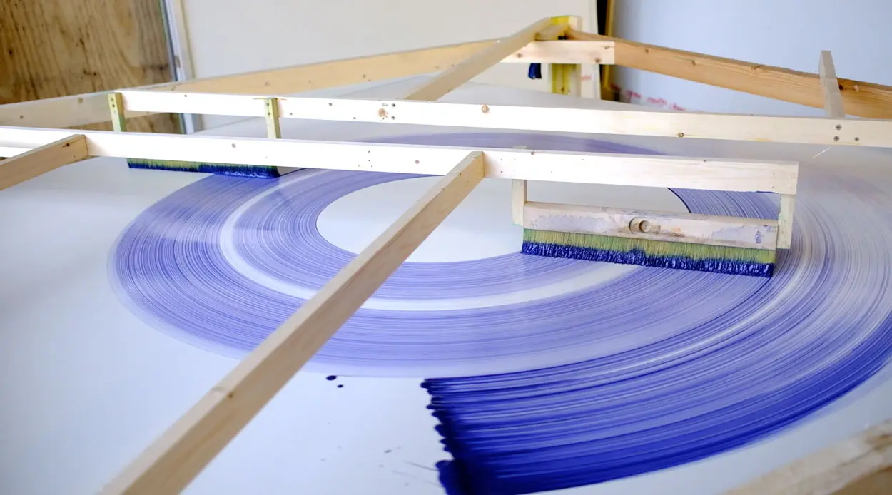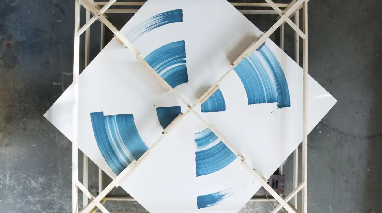 The exposed processes and mechanics are as much a part of the project as the finished paintings. The assembling and activating of the humble machines are left to the laws of physics once the contraptions are set in motion. Whilst the brushes on the arms of the contraptions could be seen as extensions or appendages of the artists themselves, once the machines are activated and the artists have relinquished all control to the mechanisms, they are as close to being observers of the performance and outcome as the rest of us.