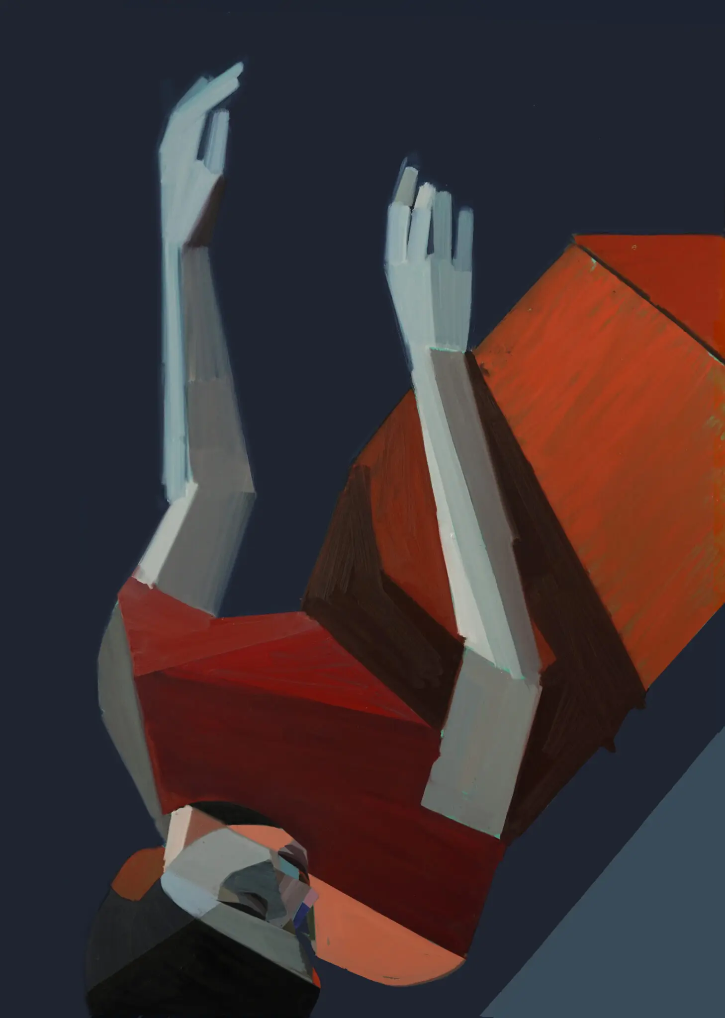 In Exhale, Kat Kristof explores the boundaries of inner and outer space through richly layered, psychologically charged works. Trained in architecture and painting, Kristof constructs immersive compositions that navigate identity, memory, and perception. Her figures—neither strictly figurative nor fully abstract—exist in architectonic dreamscapes that oscillate between fullness and emptiness, surface and depth.