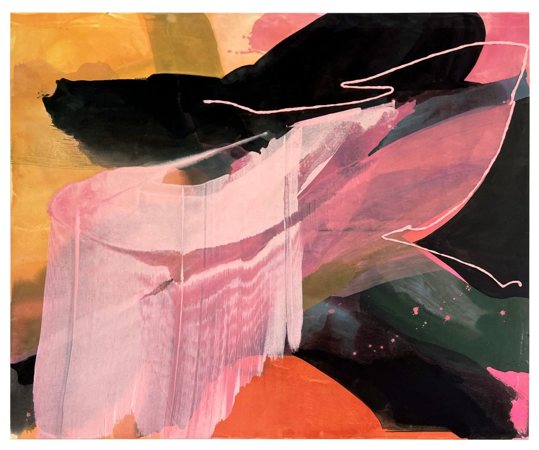 Kathryn MacNaughton’s newest work is a departure for her, moving away from her more literal figurative ornamentation to tap into conscious and unconscious movement. Here, MacNaughton has almost completely abandoned the conventions of her previous work, and this new series of bold, colour-field paintings function almost like automatic writing, where the artist allows the gestural and intuitive to operate where, previously, she may have restricted herself through structure or form. The paintings are dynamic, emotive, and powerful – reminiscent of Katarina Grosse or Helen Frankenthaler. And, for MacNaughton, both a more immediate and emotive approach to image making.