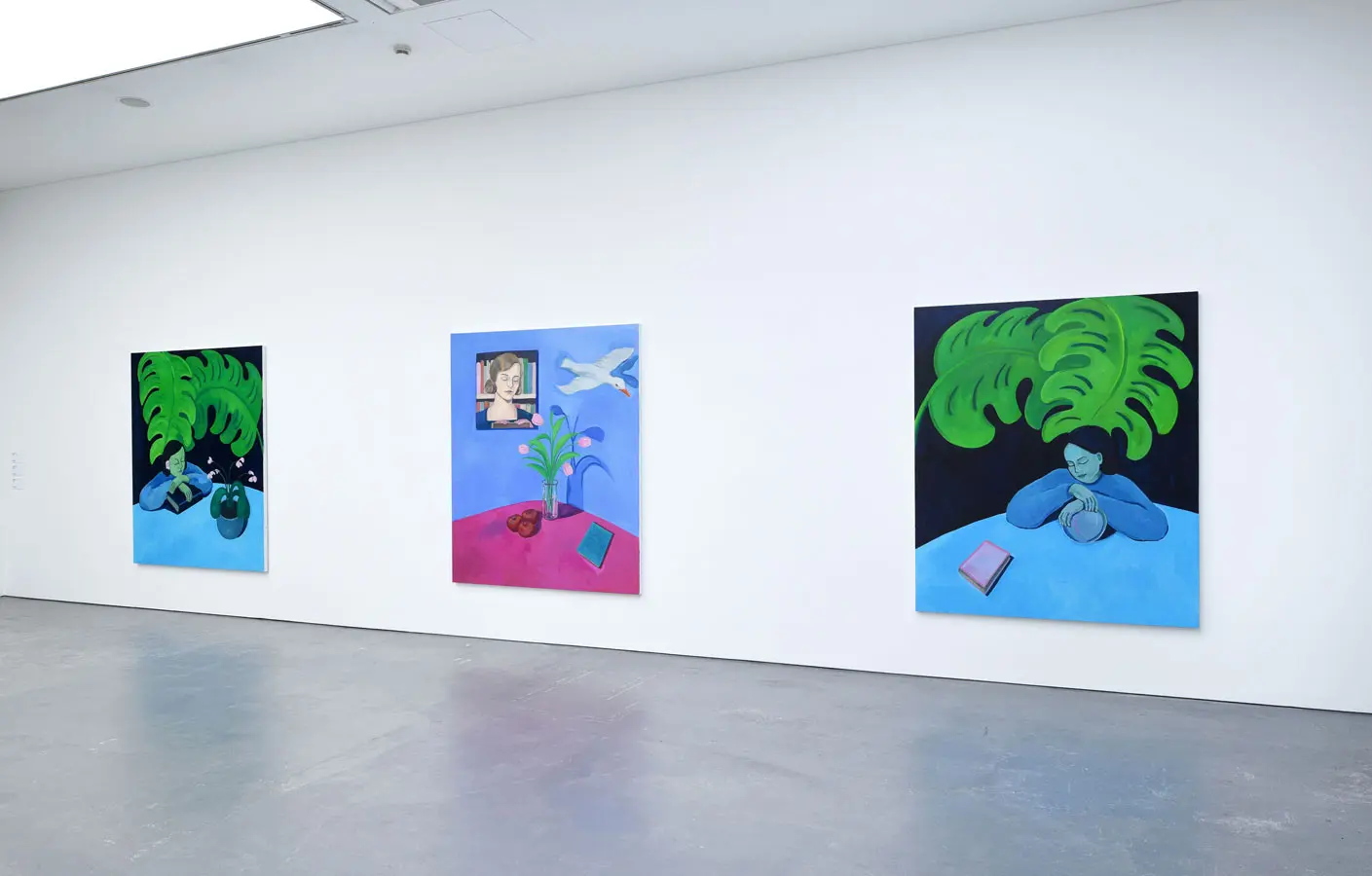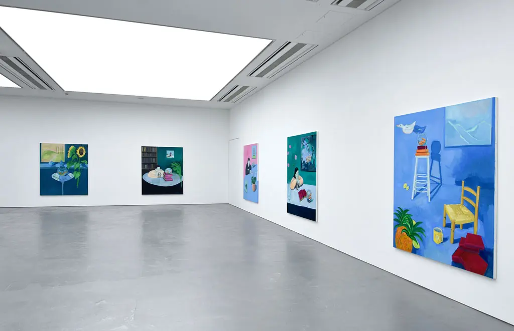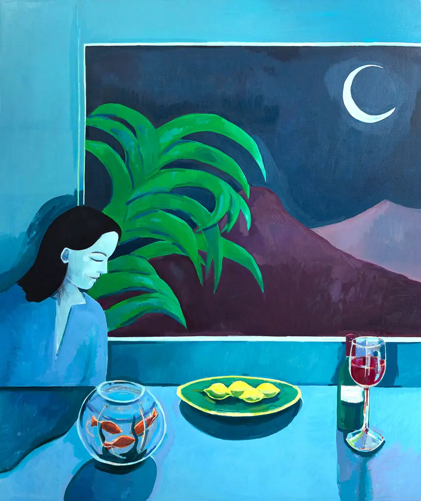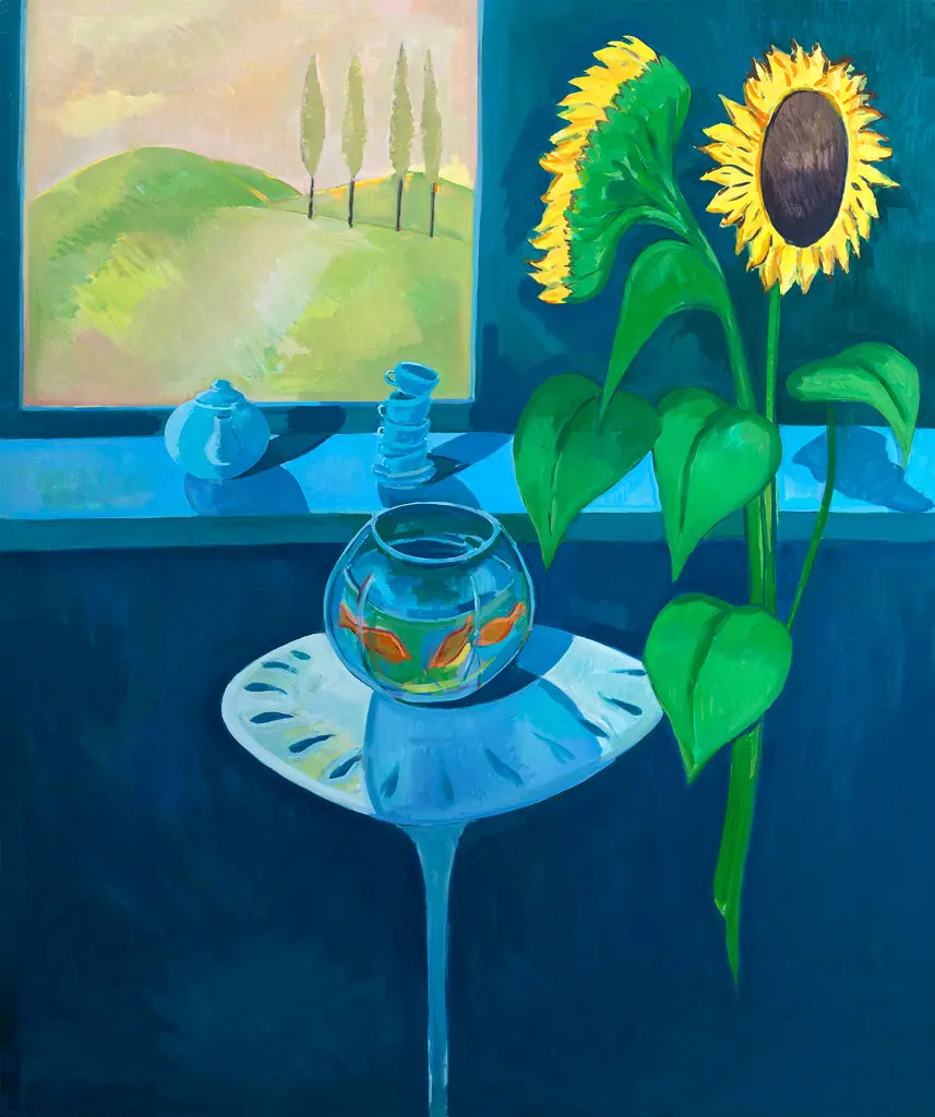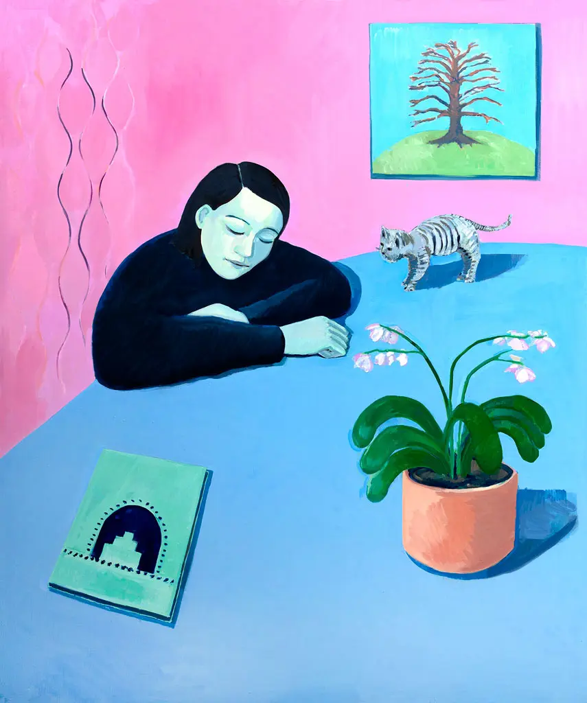 The works speak of a pleasure in the beauty of the everyday: a chine resting on a book, mugs of tea, scented lilies, splendid foliage and flowering potted plants. The arrangement of things is dreamlike but not surreal, echoing the way our surroundings often become unfocused when in deep contemplation.