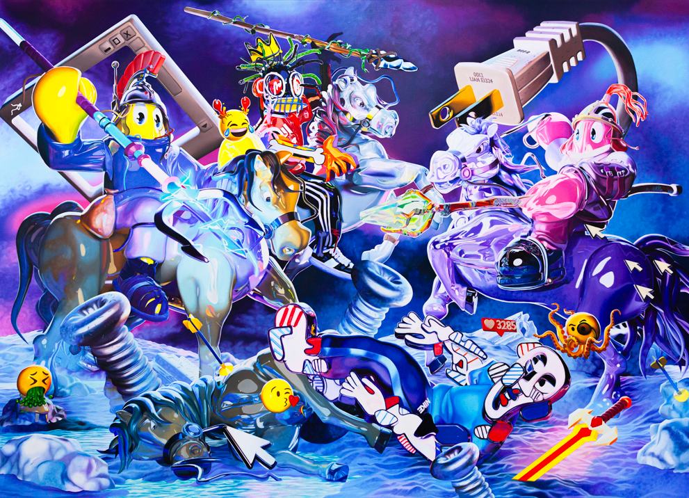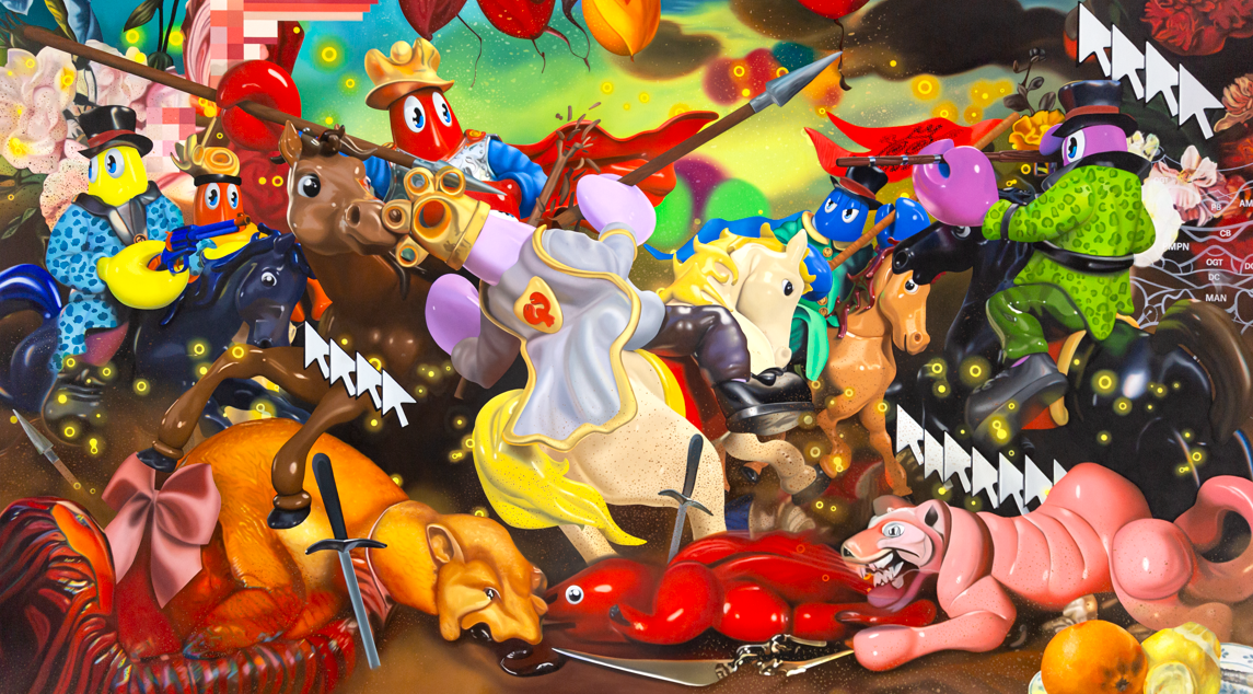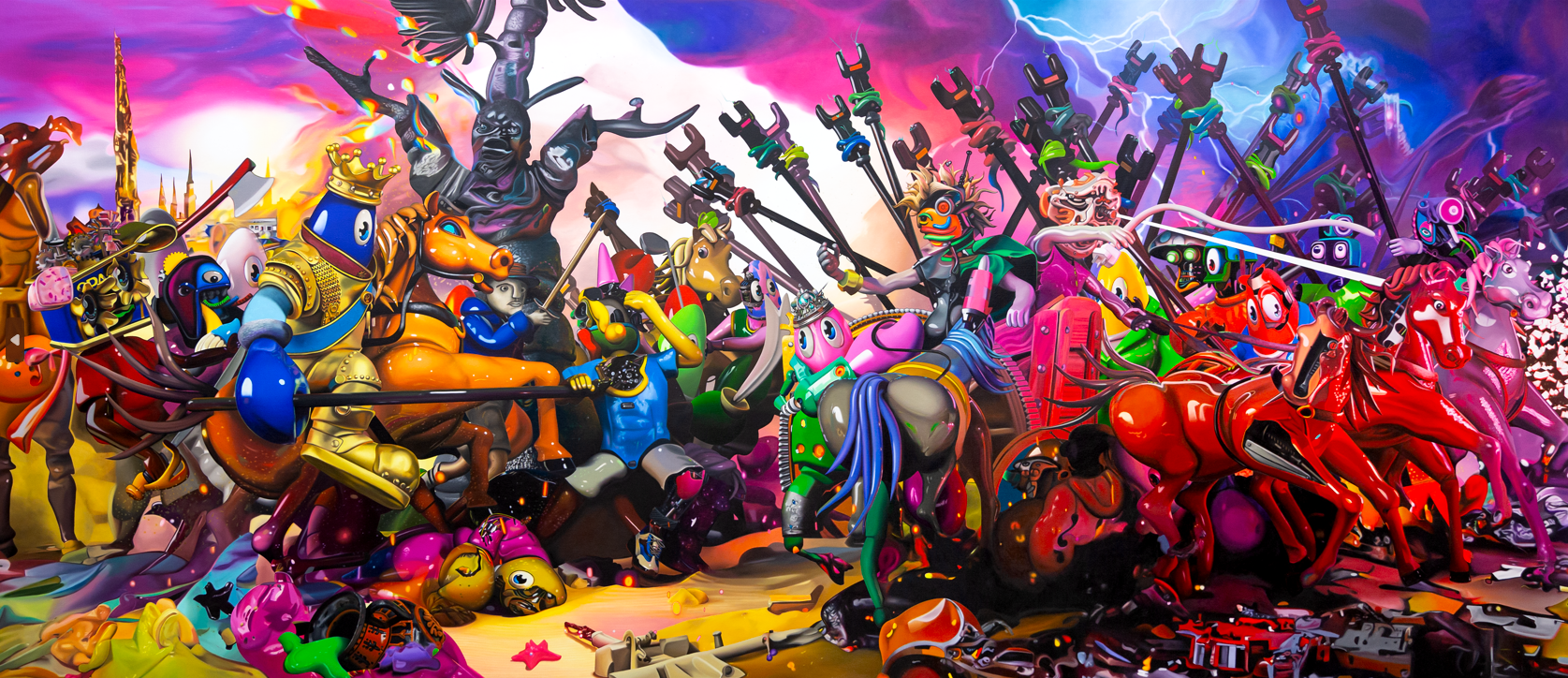 Saatchi Gallery presents The Battle for Lobsteropolis, a new exhibition by celebrated contemporary artist Philip Colbert. Known for his hyperpop history paintings, Colbert continues his signature battle scene series, where the lobster battles artificial intelligence in the retro-future world Lobsteropolis.