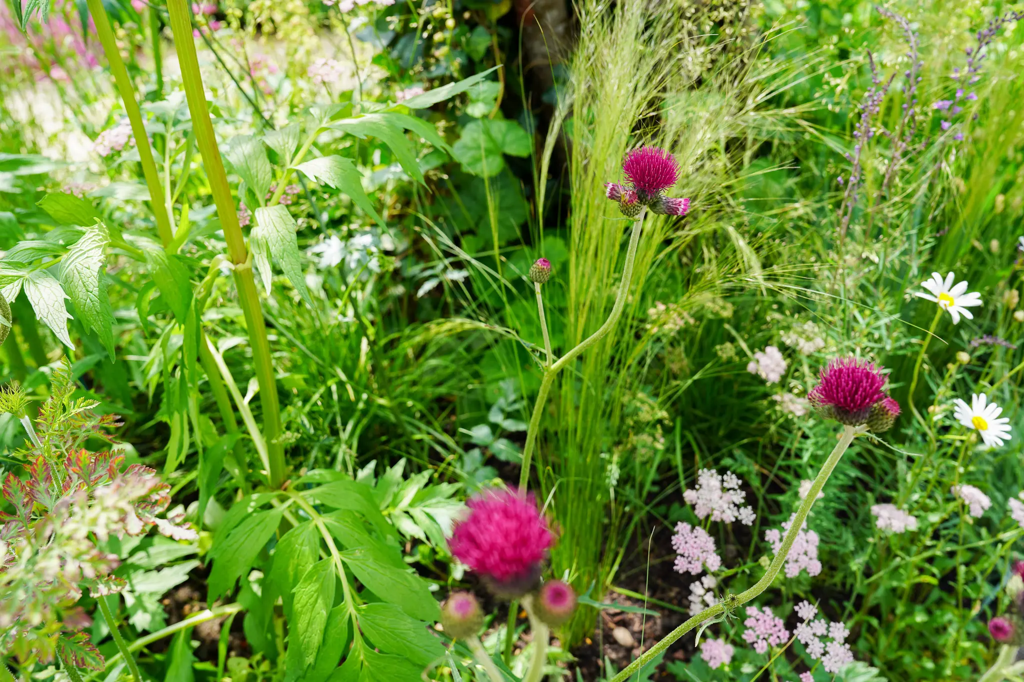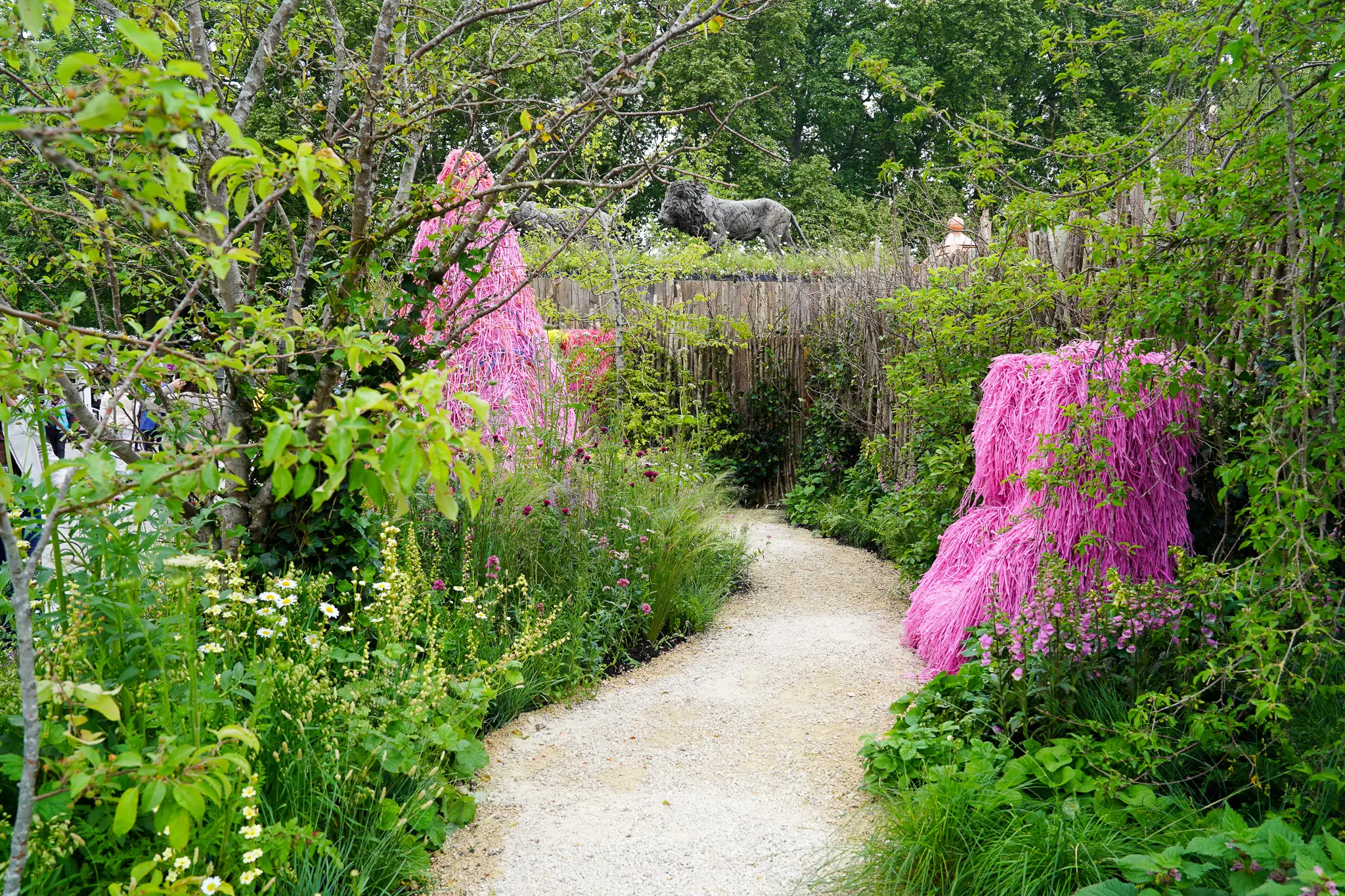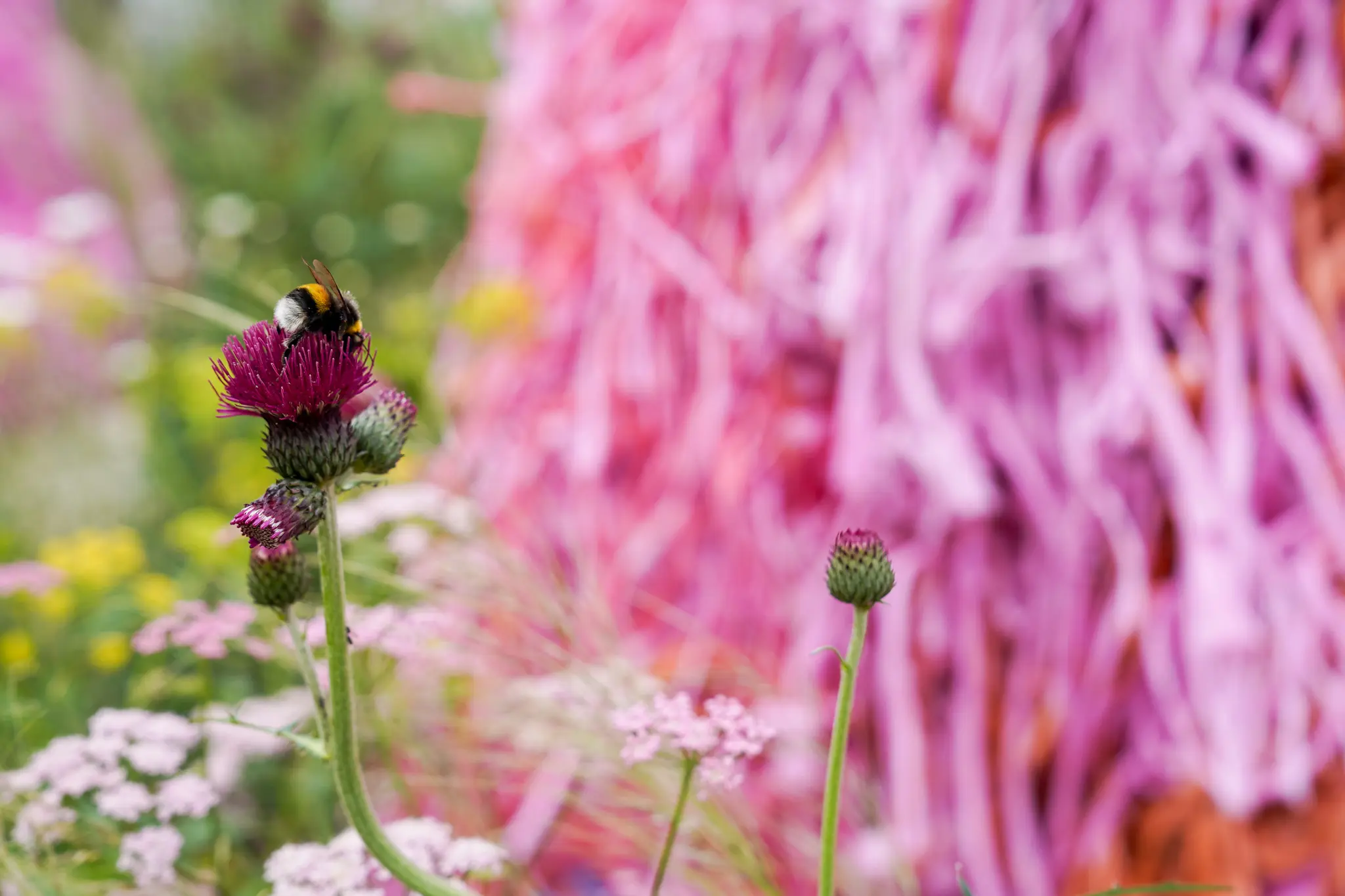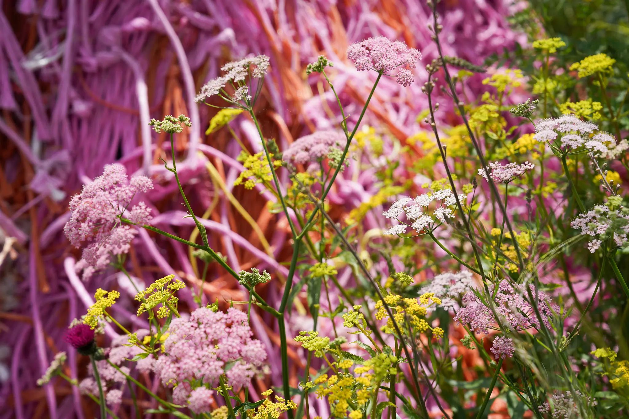 Fleming has worked closely with garden designer Naomi Ferrett-Cohen to craft the setting that her sculptures inhabit. The organic nature of her medium is important to Fleming, as is her frugal and waste-free method of acquiring it. Everything must be locally sourced and naturally occurring within the UK. Thus, her sculptures stand in a sea of wild flowers and soft grasses.