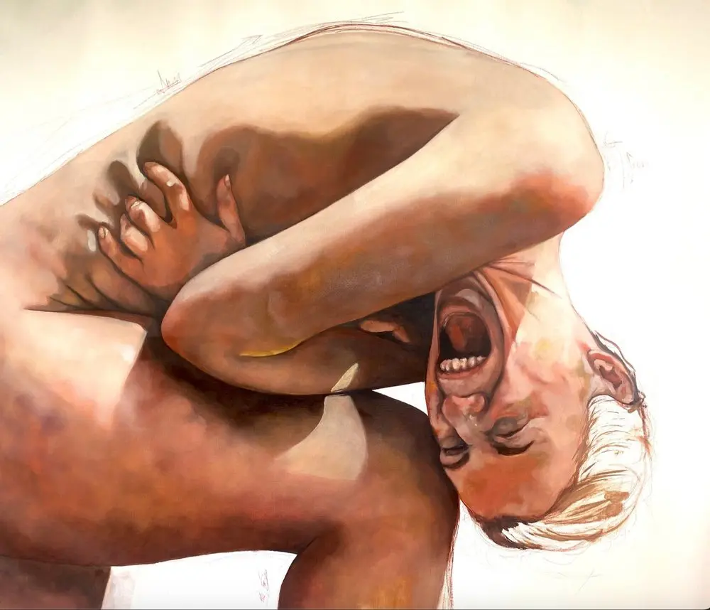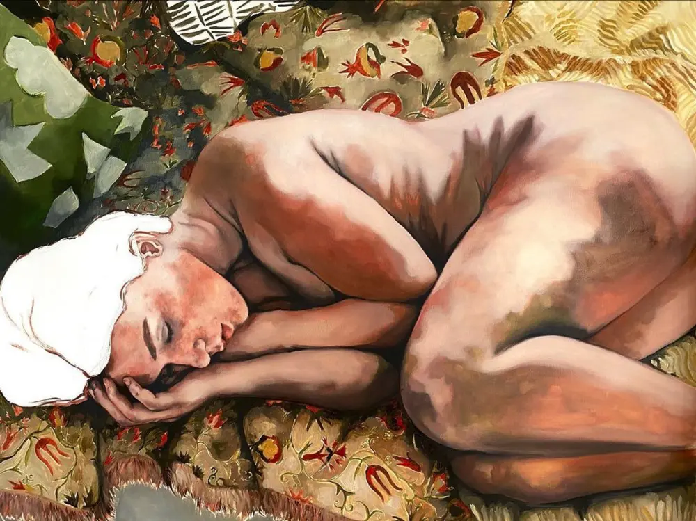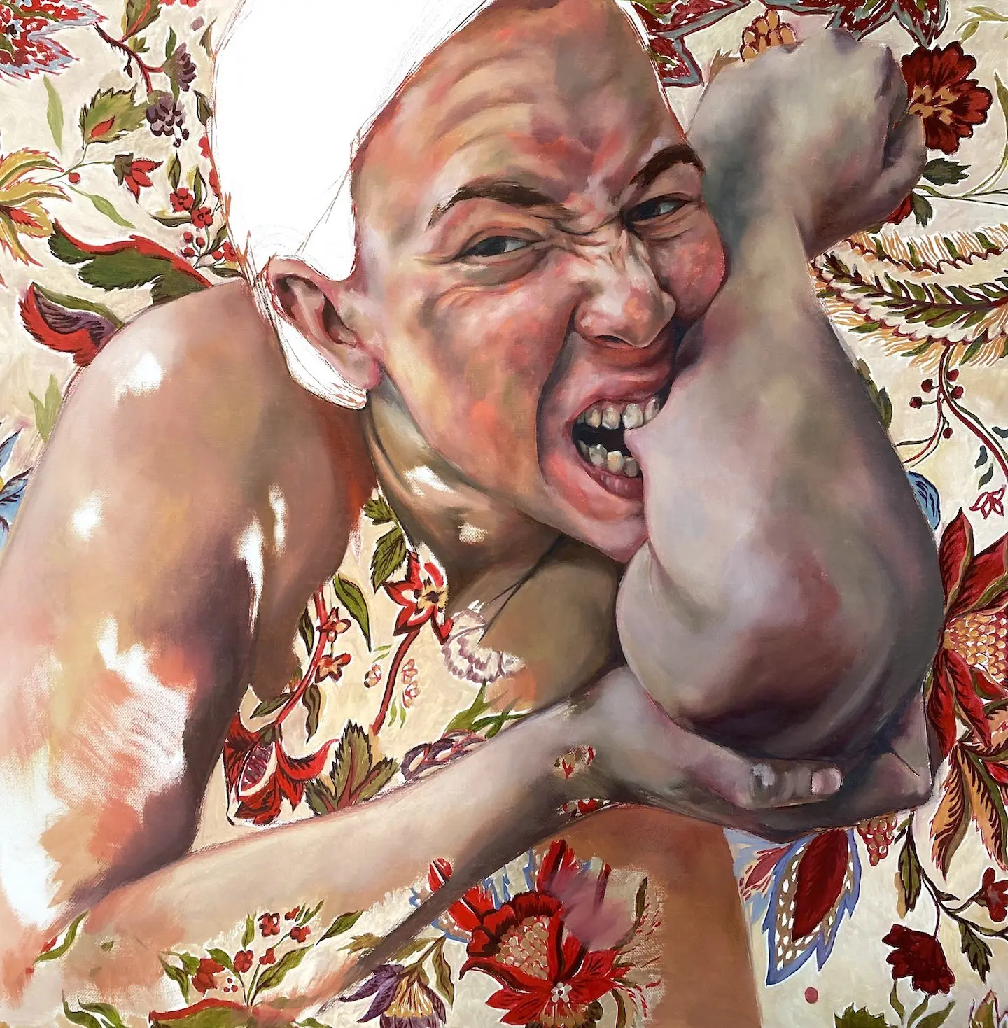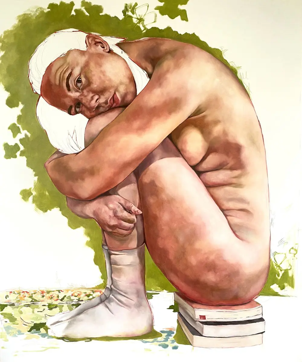 Laskari’s work is deeply personal, offering a relatable exploration of the human experience. In this series of paintings, she experiments with vibrant colours and textures to present vast surfaces of painterly flesh. Her often claustrophobic images – where powerful self-portraiture dominates in ambiguous recurring interiors – address feelings of isolation, distress, rage and vulnerability.