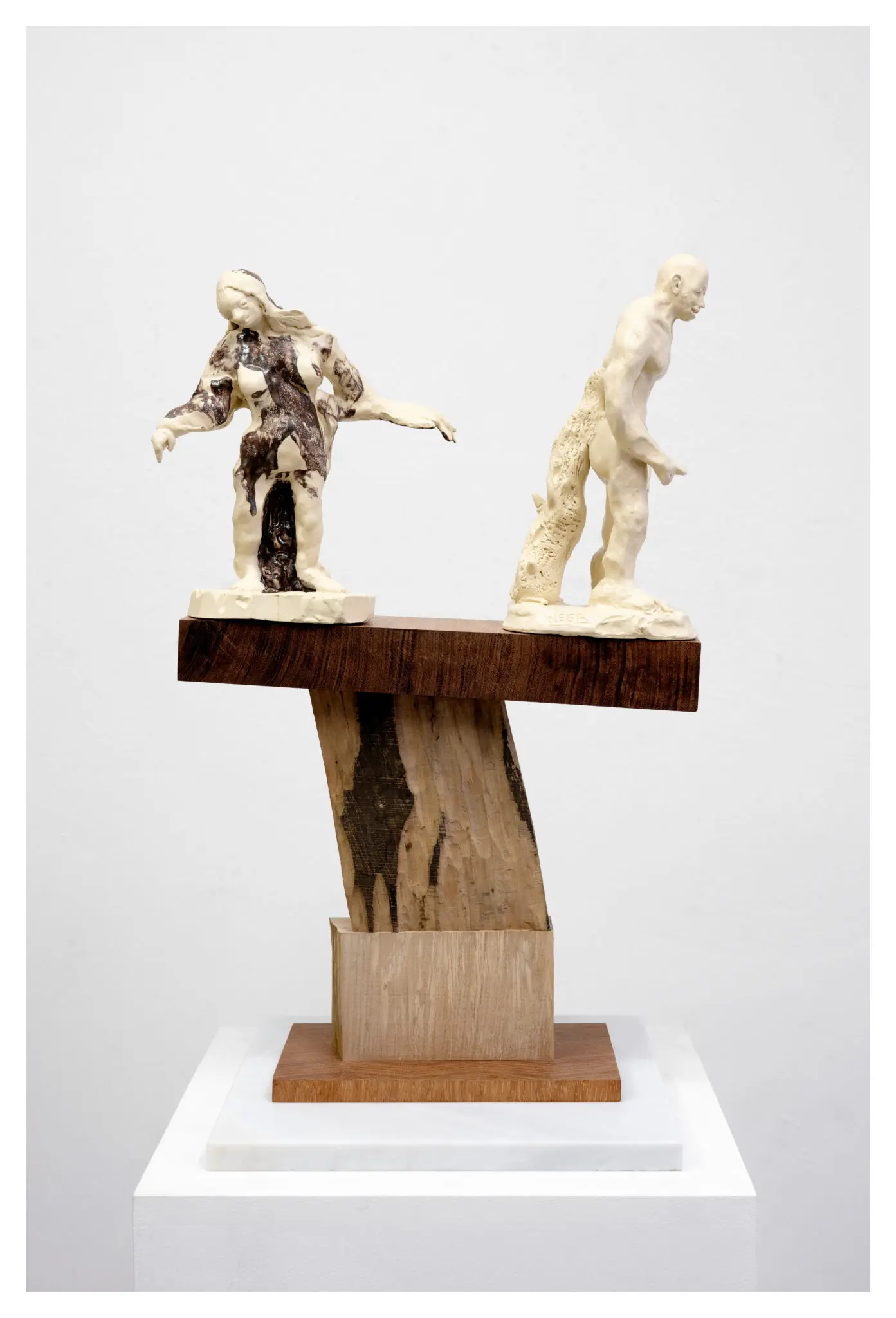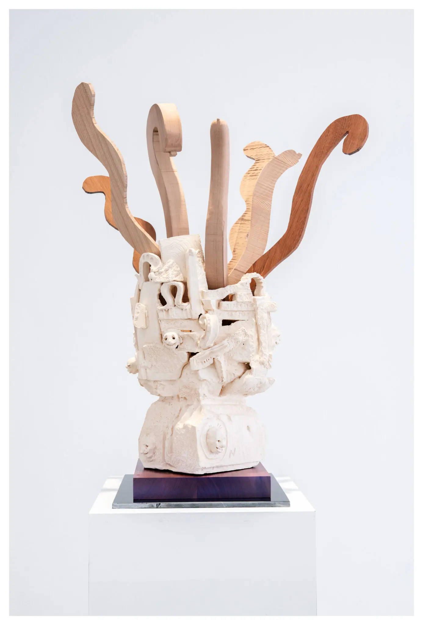Neeb likewise elevates detritus. His sculptural ‘portraits’ function as absurd totems, celebrating minor characters and cast-off forms. Both seductive and uneasy, his mobile statuettes resemble imaginary awards for offbeat figures: grotesque, tender, and faintly comic.