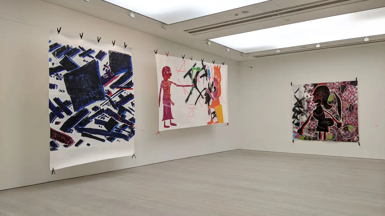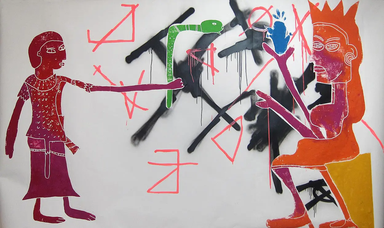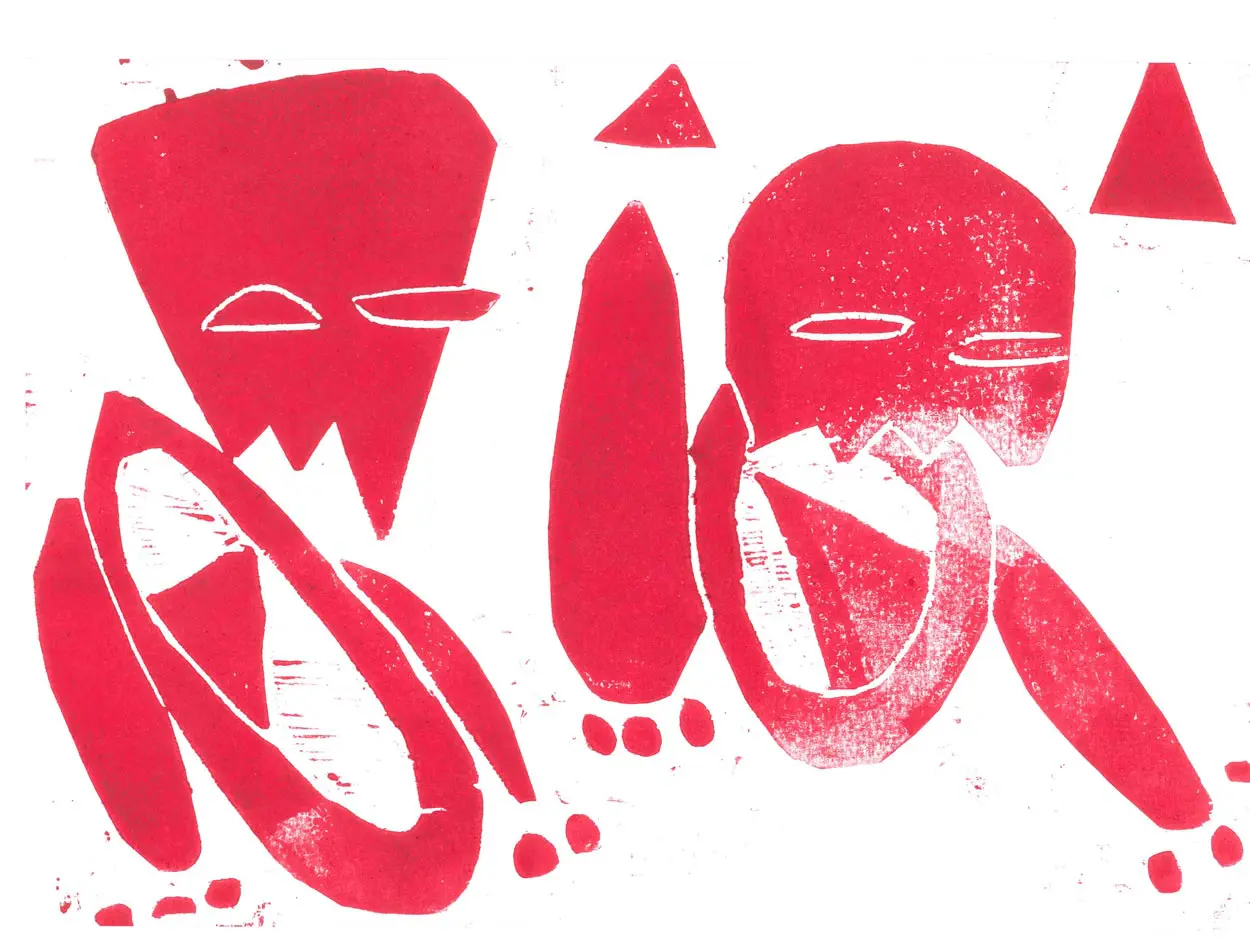 The brutal yet delicate method of production plays with the idea of “primitivism” and the connotations of labelling artworks as primitive. In these works, images are repeated, and new contexts and meanings are created with the addition or subtraction of colours or abstract landscapes. These repetitions play with the medium of printing, and the ways in which the viewer receives and processes visual information.
