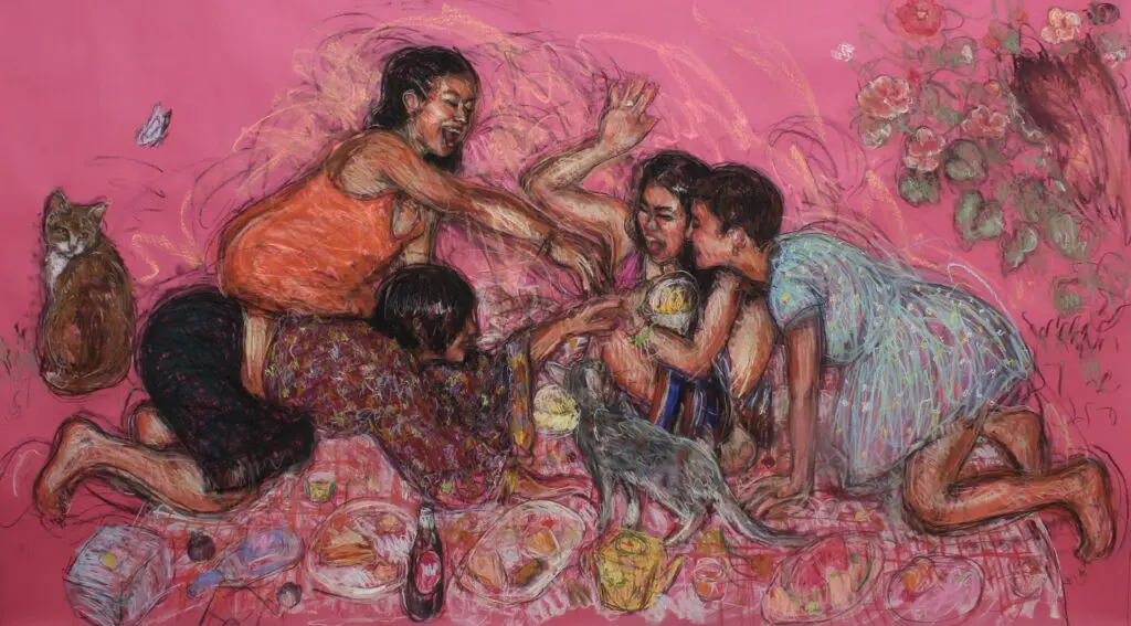 London, February 2026 – Saatchi Gallery presents a solo exhibition of works by London-based British-Malaysian-Chinese artist Caroline Wong. Titled Girls Who Devour and open to the public with free entry in Gallery 2 (Ground Floor) from 27 March to 6 May 2026, this exhibition brings together three interconnected bodies of Wong’s work: Cats and Girls, Hungry Women, and Picnics and Parties. Across pastel drawings and mixed-media paintings, Wong explores femininity, appetite, desire, and excess through scenes of convivial consumption and intimate female gathering.